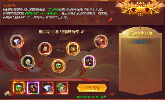 活动内容:活动期间内,每日购买锦鲤礼包可获得锦鲤祝福,次日0点购在购买玩家中随机抽取10名幸运玩家,并邮件发放奖励:锦鲤礼包+7天锦鲤称号。