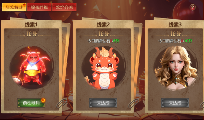 活动内容:活动期间内,参与狂欢解谜、捣蛋胖福、欢焰齐鸣,可获得红包、钻石、庆典烟花等诸多福利奖励。