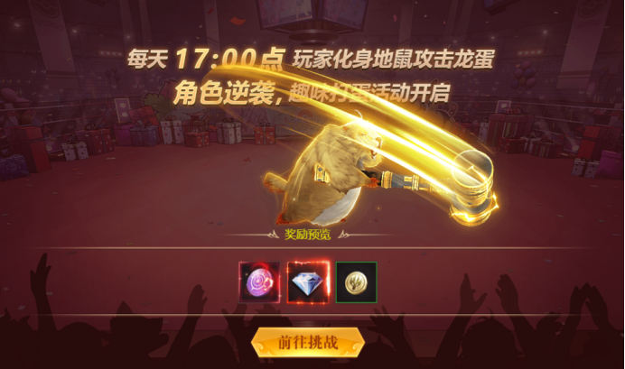 活动内容:活动期间内,每天17:00点,可化身地鼠攻击龙蛋,获得节日扭蛋币,可进行参与幸运扭蛋机活动。