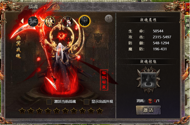 3、激活战魂可获得大量属性以及强力buff:受到攻击时,有概率为主角施加5层“幽冥血”,单次受到伤害超过最大生命值10%时,消耗1层效果并使本次伤害减半,激活后永久生效
