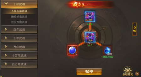 穿戴对应年限的武魂后,可消耗对应年限赋神材料(光明、黑暗神殿获取)和万物源气(荒古神迹、五行源地获取)对其进行赋神,获取大量神界属性!