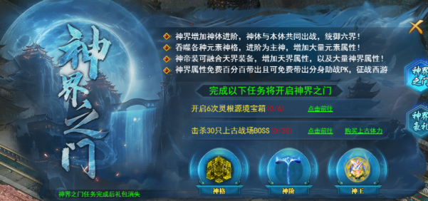 开启条件:开服满120天且修真等级满40重开启神界之门,完成开门任务即可开启神界之门。