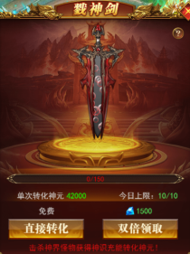 击杀神界内怪物会获得神识,通过戮神剑可将获得的神识转化为神阶升级用的神元,每天默认有10次的转化上限,每次可选择普通转化(单倍神元)或消耗钻石转化(双倍神元)。