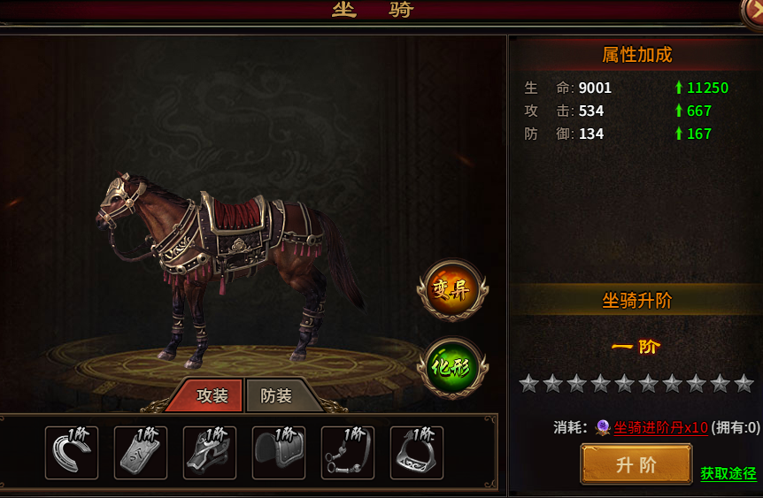 坐骑穿戴坐骑专属装备可以提升大量基础属性,推荐获取~